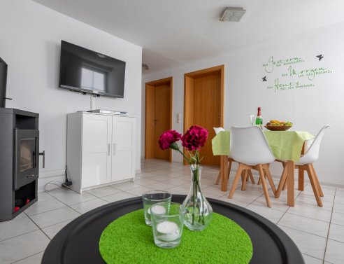 Appartement „Salweyblick“ ist ebenerdig erreichbar und bietet auf rund 60 m² geräumigen Platz für bis zu vier Personen. Ein Doppelzimmer und ein Zimmer mit zwei Einzelbetten versprechen erholsamen Schlaf. Im Wohnraum mit Essecke spendet ein moderner Kaminofen wohlige Wärme. Im Sommer genießen Sie die große Terrasse mit Pavillon, Grill und Gartenmöbeln, sowie die vielfältigen Möglichkeiten unseres großen Areals direkt am Wald.