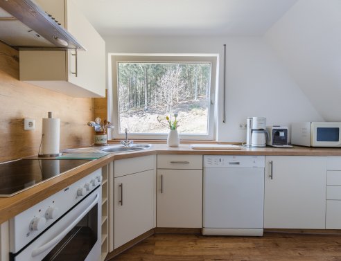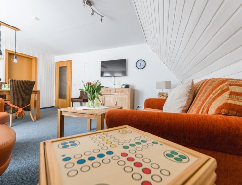 Genießen Sie erholsame Ferien in unserem Ferienappartement im „Landhaus Sonnenhang“. Der gemütliche Wohnbereich bildet das Zentrum dieses insgesamt 70 m² großen Appartements in der ersten Etage. Die geräumige Küche ist komplett ausgestattet mit Backofen, Gefrierfach, Kaffeemaschine, Toaster, Wasser- und Eierkocher sowie Mikrowelle und Geschirrspüler. Hier wird das gemeinsame Kochen zum Vergnügen; anschließend lädt der große Tisch im Wohnbereich zum Essen und Zusammensitzen ein. Das Ferienappartement verfügt zusätzlich über 2 Schlafzimmer, eines davon ist mit einem Zusatzbett versehen. Über die Außentreppe gelangen Sie direkt zur großen Liegewiese mit Ruhemöbeln, Kneipp-Tretbecken und Grillplatz mit Grillkamin.